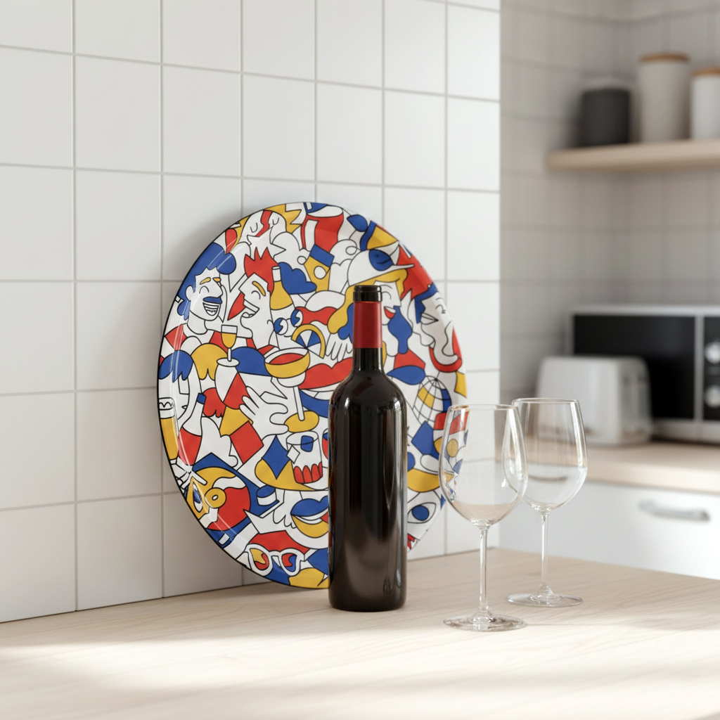 Ce plateau de 37 cm en bois stratifié est une Edition Limitée à 100 exemplaires uniquement. Il est signé de l'artiste LEMON et il est habillé d'une illustration sur-mesure de l'artiste sur le thème de la convivialité et du partage.