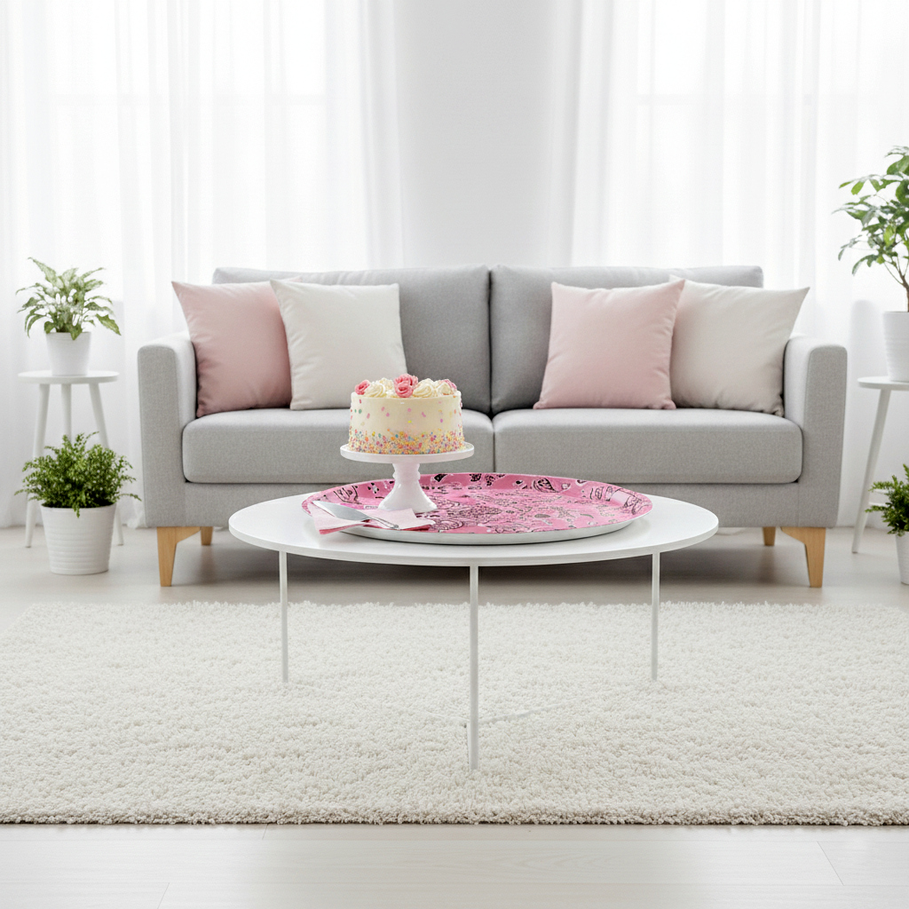 Ce plateau rond de 37 cm reprend le motif bandana dans une version rose vif. Ce décor connu donne un aspect graphique marqué, inspiré des classiques du textile. Il convient pour servir un café, un apéritif ou un petit déjeuner, et peut aussi rester en place comme accessoire décoratif.