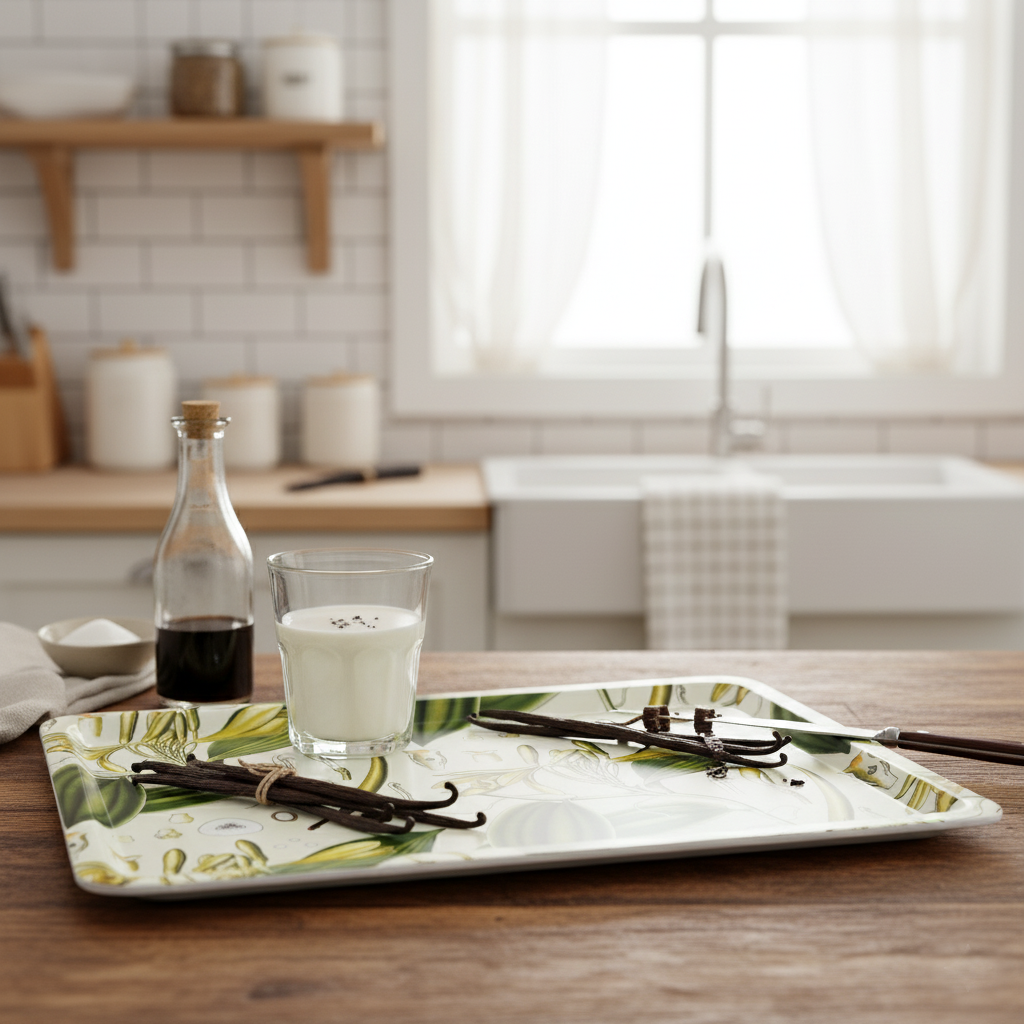 Ce plateau rectangulaire de 40 x 30 cm est décoré d’un motif végétal imprimé sur les deux faces. Ses couleurs naturelles s’accordent facilement avec une cuisine ou un séjour. Il est idéal pour servir un petit déjeuner, un apéritif ou quelques boissons, et peut aussi rester posé comme élément décoratif.